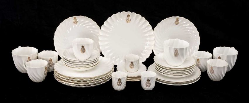 ROYAL NAVY INTEREST: HARLEQUIN PART SERVICE OF COPELAND & SHELLEY PORCELAIN, shank fluted tea and coffee wares, each gilt with crowned naval insignia with legend 'SIGIL: OFFI: MAG: ADMIR: MAG: BR: &C.', thought to be china from the Royal Navy Club in Mayfair or a Mess, comprising three large teacups, five smaller teacups, and three coffee cups, various saucers and some dessert platesProvenance: private collection MonmouthshireComments: some staining and hairline cracks, some gilt insignia rubbed, inspection advised
