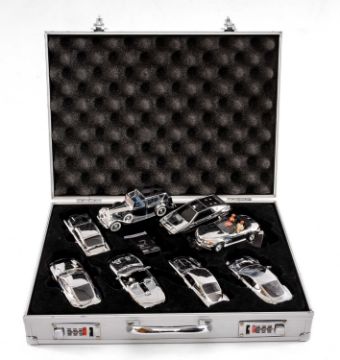 CORGI JAMES BOND 007 SET OF 8 CHROME PLATED CARS, including Aston Martin DB5 (Thunderball), Aston Martin DB5 (Casino Royale), 1937 Rolls Royce Phantom II Sedanca De Ville (Goldfinger), Lotus Underwater (The Spy Who Loved Me), Aston Martin V12 Vanquish (Die Another Day), Aston Martin DBS (Casino Royale), Jaguar XKR (Die Another Day), 1996 BMW Z3 (Goldeneye), in attaché type caseProvenance: private collection Gwent.Comments: Case dented, no COAs.