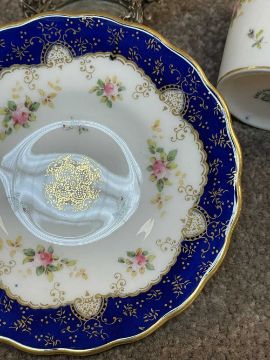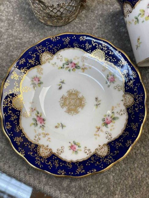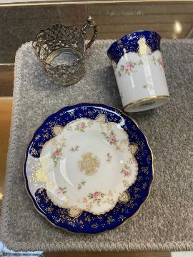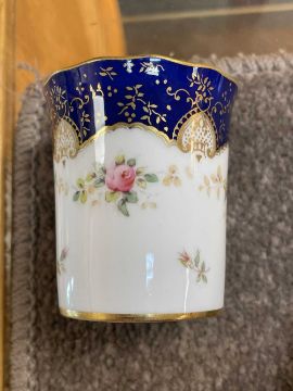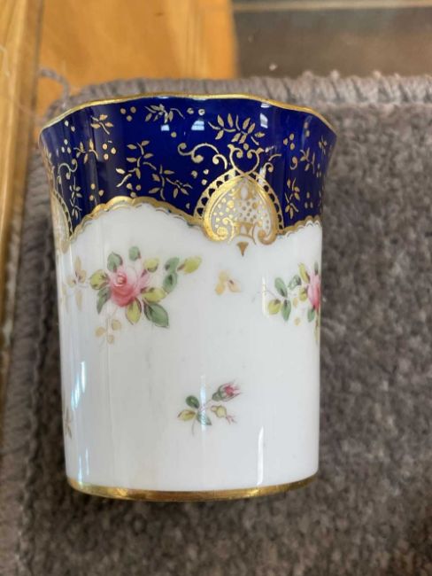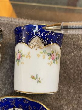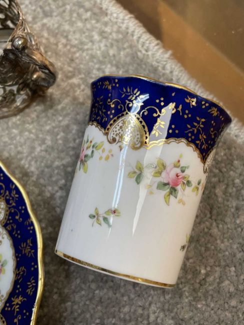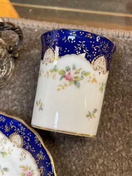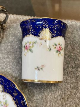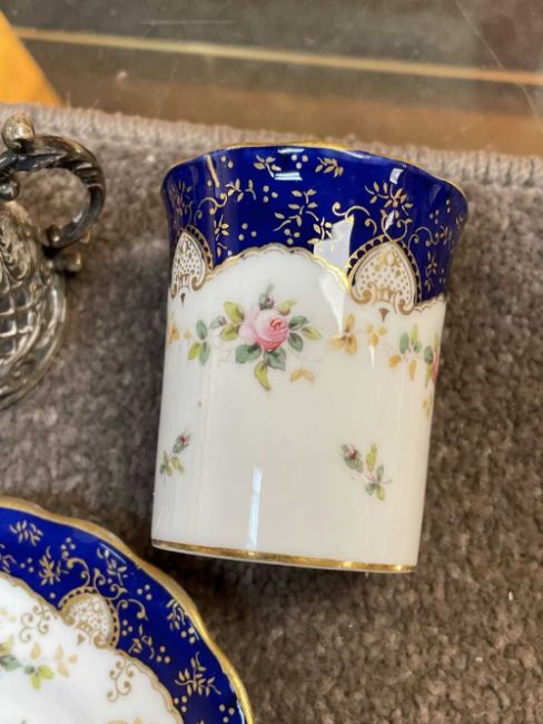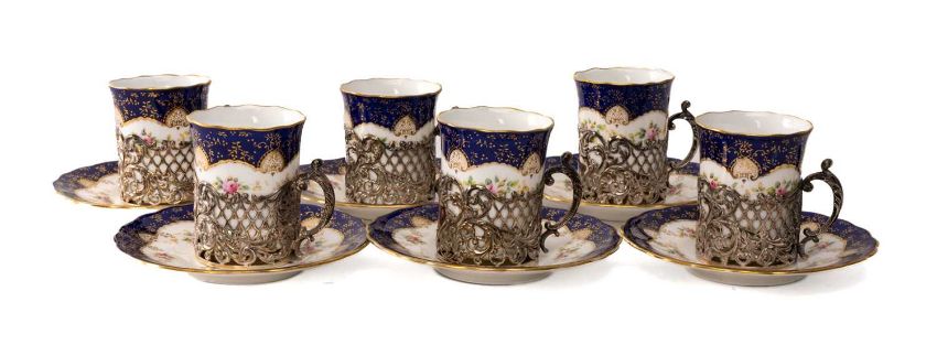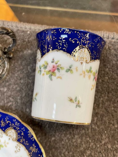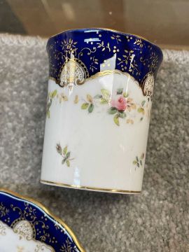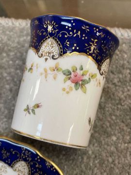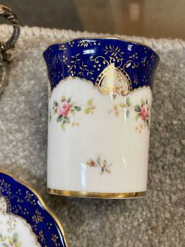 SILVER MOUNTED COALPORT PORCELAIN COFFEE SERVICE, James Dixon, 1905, painted with pink rose and blue borders with gilt highlights (12)Provenance: private collection GlamorganComment: one can chipped rim