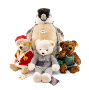 STEIFF TEDDY BEARS, to include large penguin (504976), 40cms (h), Christmas bear (654688), teddy bear with watering can (654640), and Steiff 'Light at Night' teddy bear (113680) (4)Provenance: private collection Vale of GlamorganComments: all good, some with drop tags, all with buttons to ear