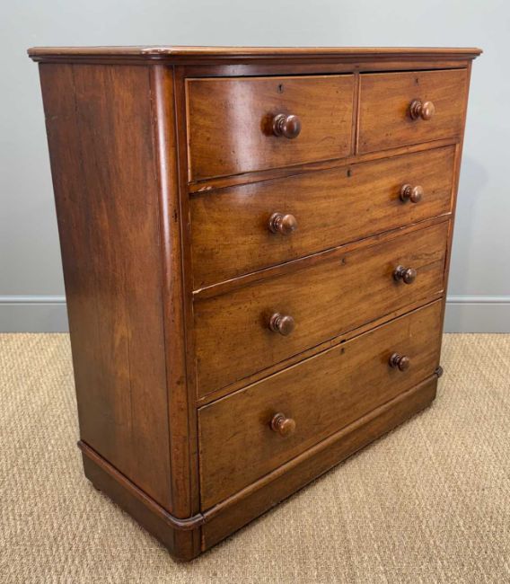 19TH CENTURY MAHOGANY CHEST, two short over three long, bottom drawer floor deep (incorporating plinth moulding), turned handles, 120 (h) x 119 (w) x 50cms (d)Provenance: private collection MonmouthshireComments: good colour, normal stains and light scratches, some veneer chips and losses, one handle damaged, lhs side with splits, inspection advised