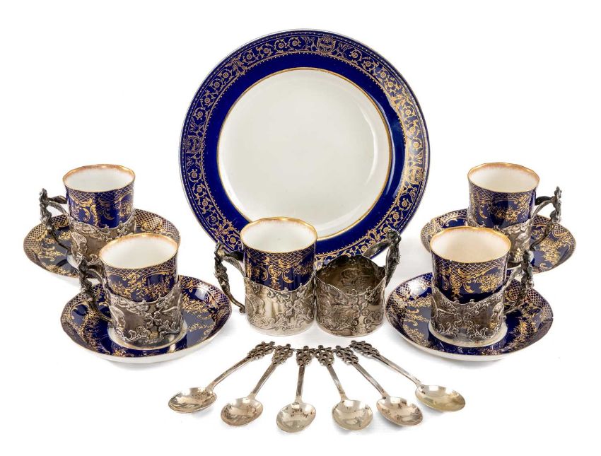 SET SIX VICTORIAN SILVER COFFEE CAN HOLDERS, William Comyns, London 1896, decorated with amorini and engraved with armorial crests; set of 6 Edward VII silver coffee spoons with pierced gothic handles; 5 Crown Staffordshire porcelain coffee cans and 4 saucers, Minton tea plateProvenance: private collection GlamorganComment: Staffordshire cans stained and saucers cracked/chipped, silver good overall.