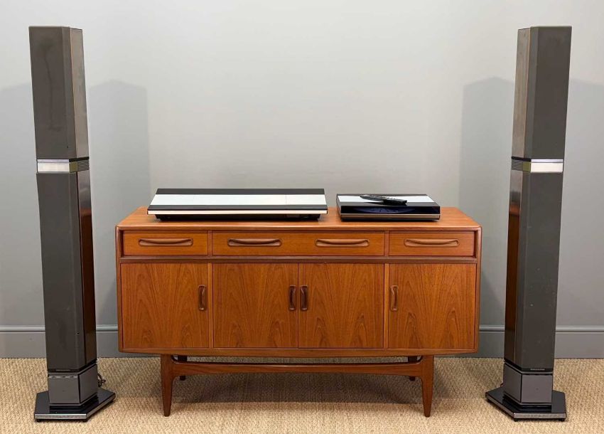 LATE 80s BANG & OLUFSEN HI-FI SYSTEM including, Beocenter 9000 radio/cassette & CD music centre, Type 2501, dated 1986; Beogram 9000 Stereo Turntable, MMC4 cartridge stylus, Type 5961, dated 1987; pair of Beolab Penta 2 Active Loudspeakers, Type 6622, dated 1988; together with a Beolink remote control.Provenance: consigned via West WalesComments: storage soiled, general light scratches, speaker grill cloth with holes, general tarnish to stainless steel, dings to rear of speaker, Beolink battery compartment contained leaked batteries: we have powered-up the music centre and managed to play the radio and the CD player, the turntable is totally untested, additionally we have only played the system through one speaker (at a time) as one cable speaker appears to be damaged, we have played and powered-up both speakers. DISCLAIMER this is a very basic condition report and therefore the system must be deemed as untested with inspection advised - it does sound marvellous through one speaker though!EDIT. We have now been able to power-up the turntable but have no record to completely test basic functions, what we can say is that without a record the turntable will spin for a short period when play is pressed, but the tone arm remains in the rest position, as it should. The turntable will also reverse spin (to clean a record). The speeds of 33 or 45 are illuminated on the tone arm. The teak sideboard is obviously not included in this lot but is featured elsewhere in the auction.