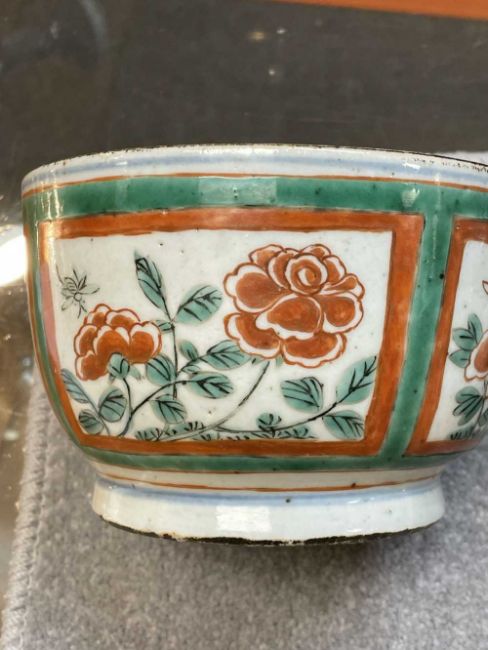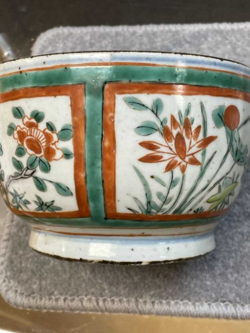 CHINESE WUCAI PORCELAIN BOWL & COVER, Transitional/Kangxi, decorated with the panels of insects and lotus, peony, chrysanthemum and plum blossom reserved on green ground, with thin underglaze blue lines, 14 (h) x 15cms (diam.)Provenance: private collection Cardiff.Comments: old chip to inner rim, crack to body.