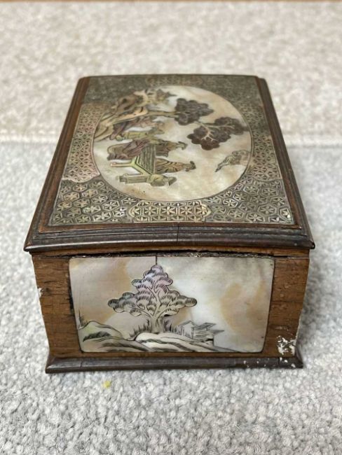 SMALL CHINESE HARDWOOD INCENSE BOX & COVER, inlaid with mother of pearl and decorated with an oval medallion depicting scholars and attendants in a garden, brocade border, further landscape panels to the sides, 10.5cms (w)Provenance: private collection MonmouthshireComments: top slightly warped, one landscape side panel missing, some mother of pearl damaged, inspection advised