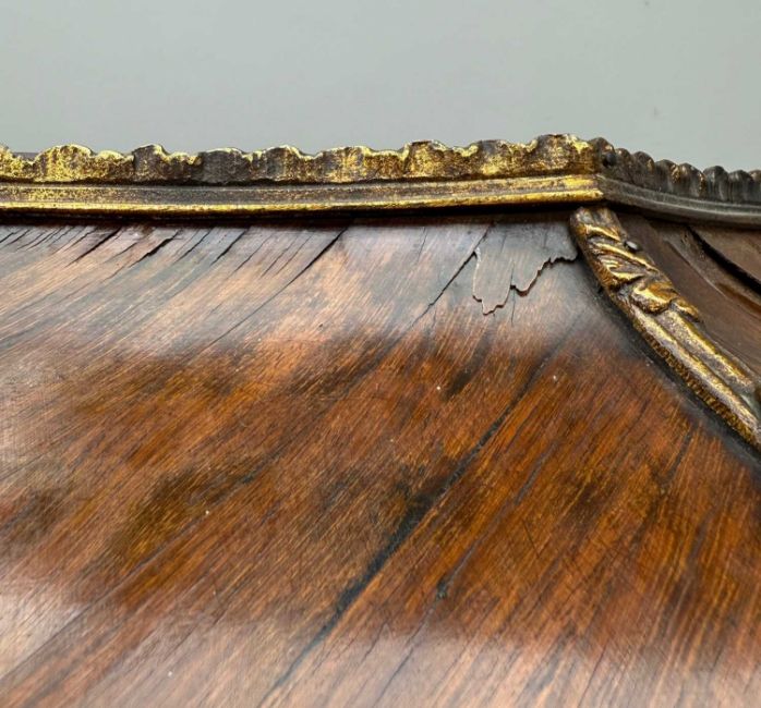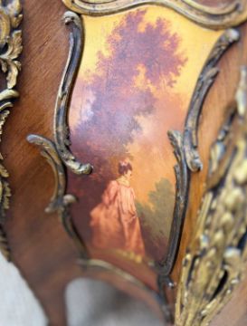 LOUIS XV STYLE KINGWOOD & GILT BRONZE VERNIS MARTIN VITRINE, in the manner of Zwiener, domed top with gilt-bronze acanthus mounts & caryatid surmounts, single shaped door and side panels framed by gilt-bronze foliate mounts, painted panels in the manner of Kauffmann by Paoli, raised on six shaped legs terminating with sabots, 200 (h) x 122cms (w)Provenance: private collection Vale of GlamorganComments: shrinkage to dome, splits to veneer, shrinkage/repairs and scuffs to painted panels, inspection advised