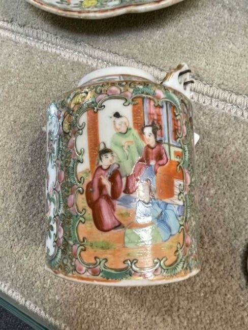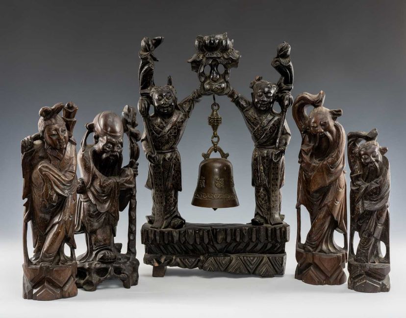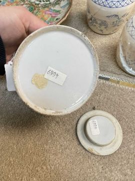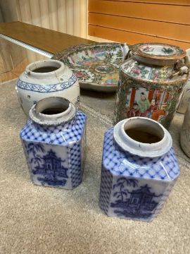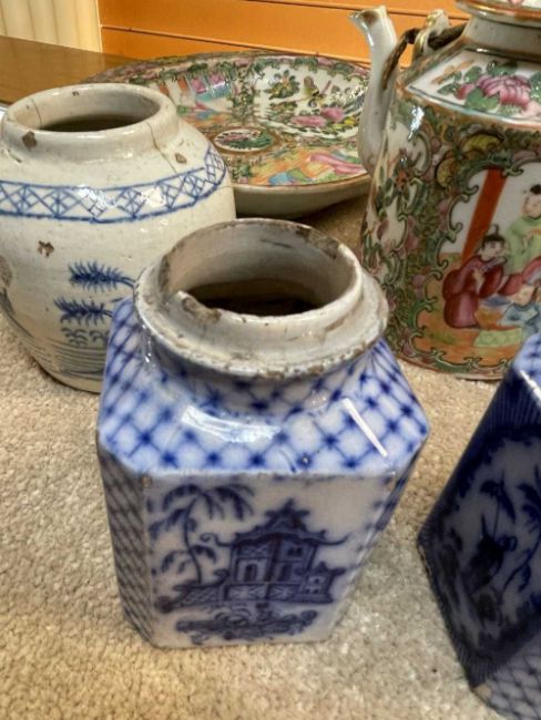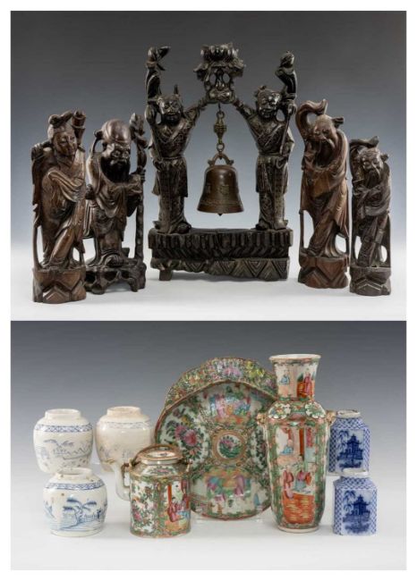 CHINESE WIRE-INLAID HARDWOOD CARVINGS & PORCELAIN, comprising four figures, and a figural gong stand, the assorted Chinese Canton Famille Rose porcelain including teapot, vase, shell-shaped dessert dish, and five English blue printed pottery Chinoiserie jarsProvenance: deceased estateComments: carvings variously chipped, cracked, repaired, porcelain chips and reglued damage, inspection advised.