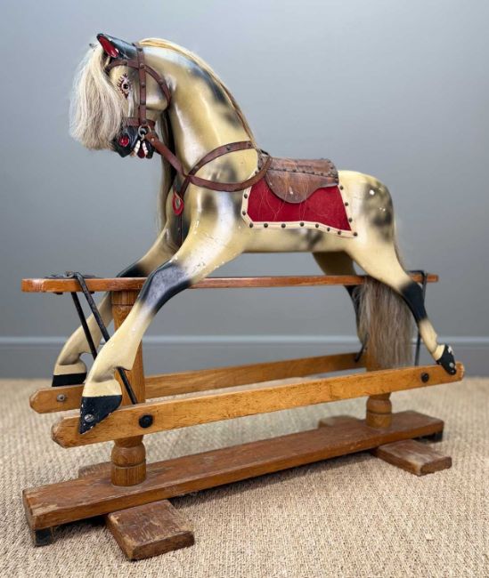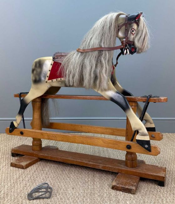 F. H. AYRES DAPPLED GREY ROCKING HORSE, open mouth, glass eyes, horse hair mane and tail, leather saddle, safety base, 90cms (h) (floor to ear)Provenance: private collection LondonAuctioneer's Note: F H Ayres traces its roots back to London in 1810 when Edward Ayres started his business as a cabinet maker, beautiful rocking horses were then produced in great numbers from 1864 from workshops in Aldgate. They were regarded as the Rolls Royce of horses and retailed through famous department stores such as Harrods. A famous photo shows a young Princess Elizabeth (QEII) with her sister on an Ayres rocking horse at St Paul's Walden Bury in 1932.Comments: base with manufacturers stamp, chips and cracks, normal wear, stirrup straps missing, inspection advised