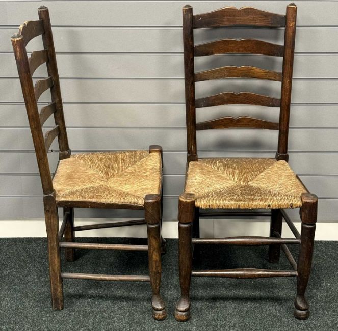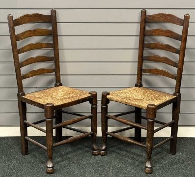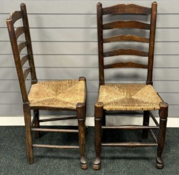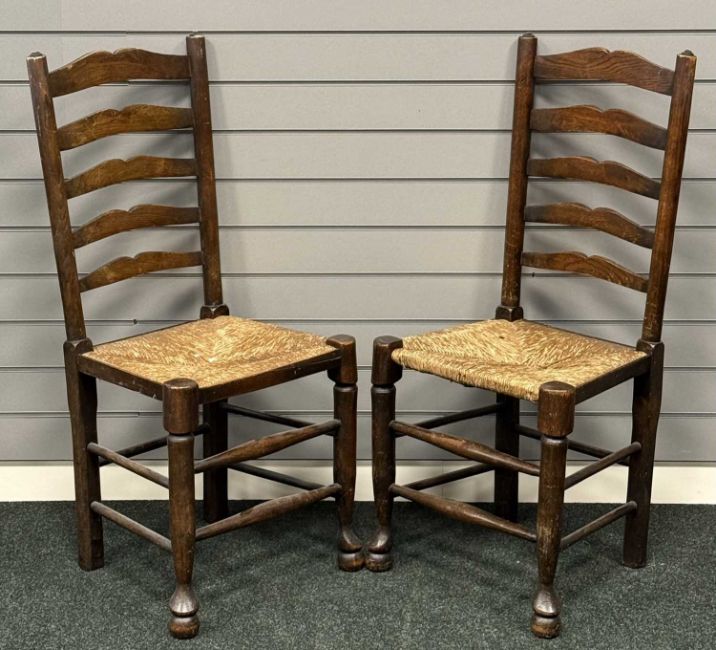OAK GATELEG TABLE on turned and block supports, 72 (h) x 50/150 (w) x 105cms (d); and a set of four rush-seated ladder-back chairs (5)Provenance: private collection Cheshire