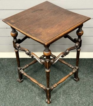 WILLIAM & MARY STYLE STAINED OAK TABLE, square top, 70 (h) x 50 (w) x 50cms (d); and another table 72 (h) x 61 (w) x 45cms (d) (2)Provenance: private collection Cheshire