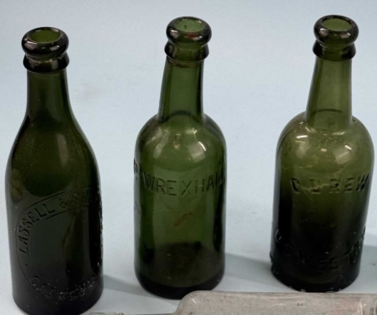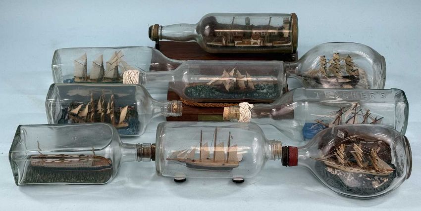 NINE VARIOUS MODEL SHIPS IN BOTTLES, two in Hague dimple bottles and two mounted on oak stands, with small collection of glass shipwreck bottlesProvenance: private collection
