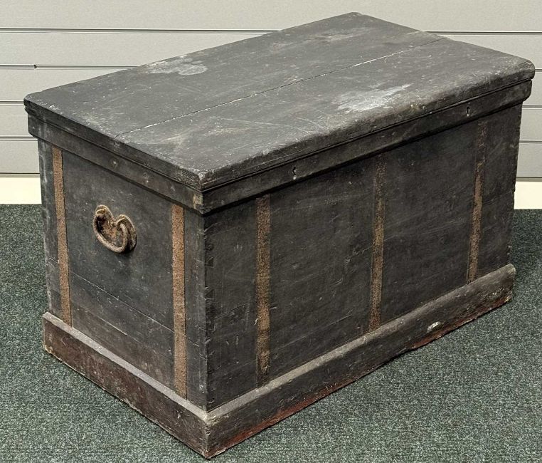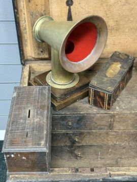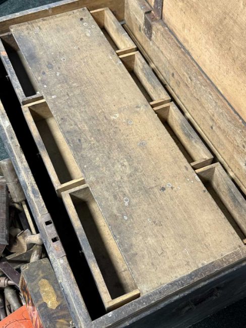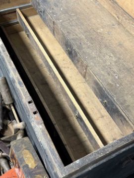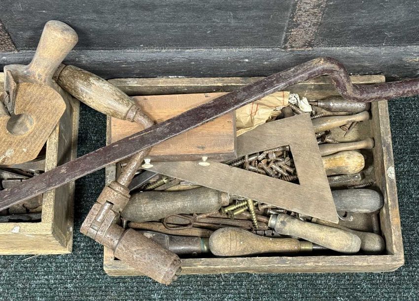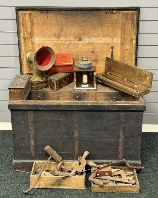 VICTORIAN SHIPWRIGHTS / CARPENTER'S PINE TOOL CHEST, late 19th century, fitted with sliding drawer compartments, number of vintage tools, boxed brass parallel rule, Sestrel mariner's compass by Henny & Browne, etc., chest 60 (h) x 94 (w) x 57cms (d)Provenance: private collection
