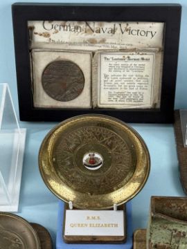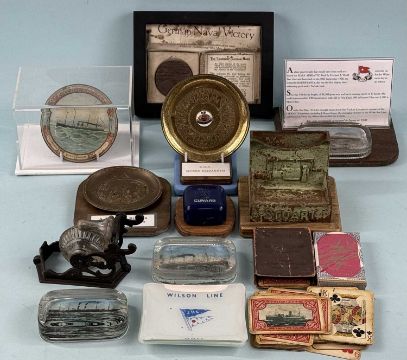 ASSORTED MARITIME COLLECTABLES, including replica of the German Lusitania medal, tin American Line pin tray, RMS Queen Elizabeth pin tray, two Wilson Line ashtrays, Anchor Line playing cards, and another set, oval cast brass lifeboat station 'Good Luck' dish, etc.Provenance: private collection