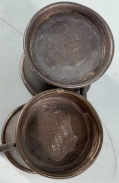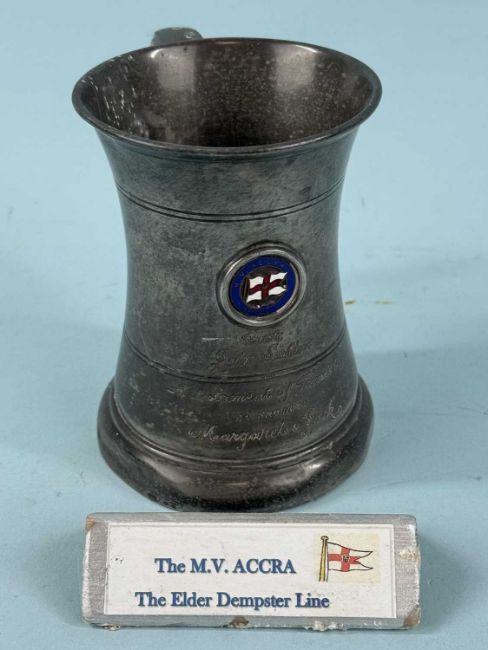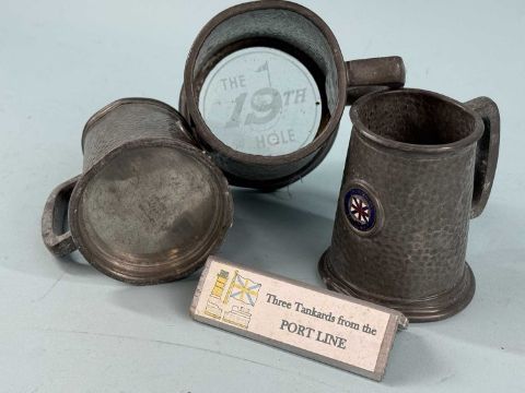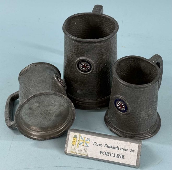 SHIPPING LINE METALWARE, including souvenir tankards from the Orient Line RMS Ormonde, Port Line, and SS Carmania; and pair of brass jugs with hinged covers, Bibby Line crests, 22cms (h)Provenance: private collection