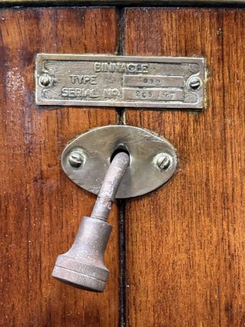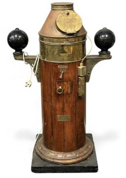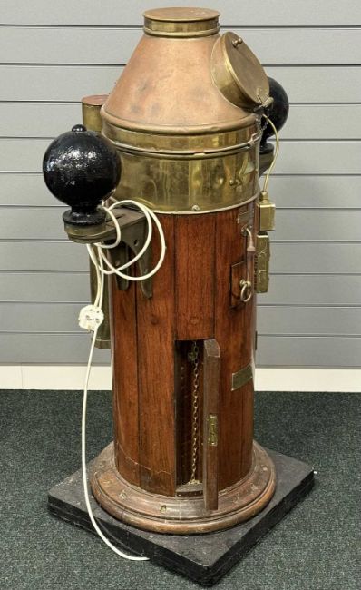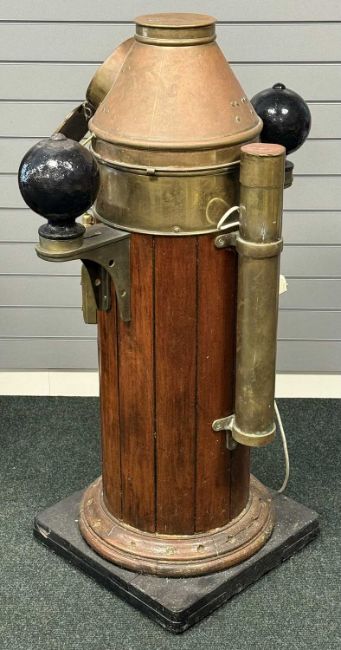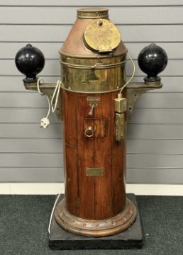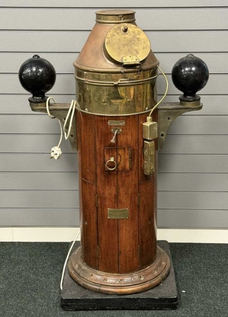 KELVIN & HUGHES OAK & BRASS SHIP'S BINNACLE, the cowling with glass viewing port, 117cms (h)Provenance: private collection