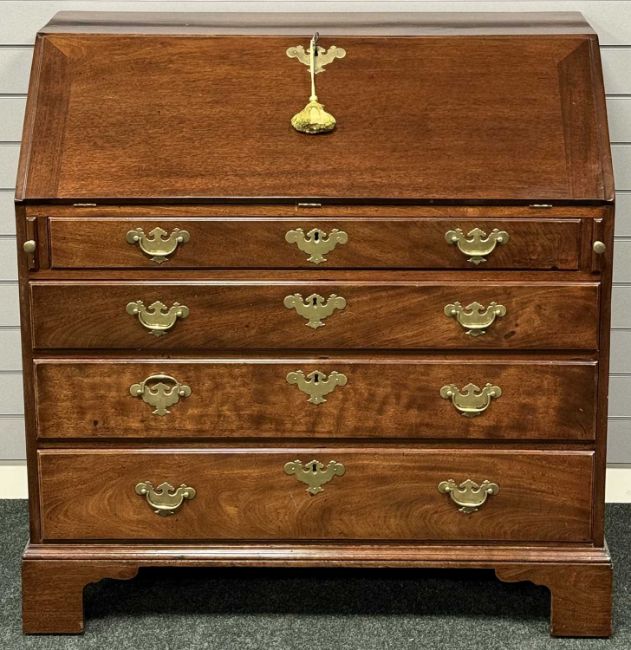 GOOD 20TH CENTURY MAHOGANY FOUR-DRAWER BUREAU with drop-down front and fine fitted interior, brass swing handles and backplates, and on bracket supports, 108 (h) x 109 (w) x 55cms (d)Provenance: private collection Cheshire