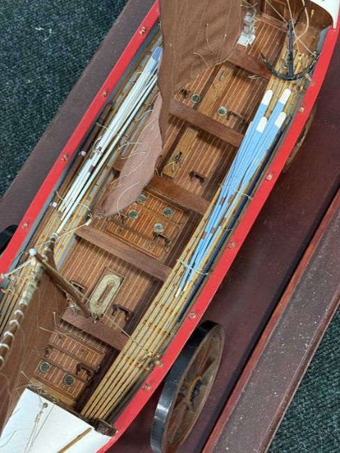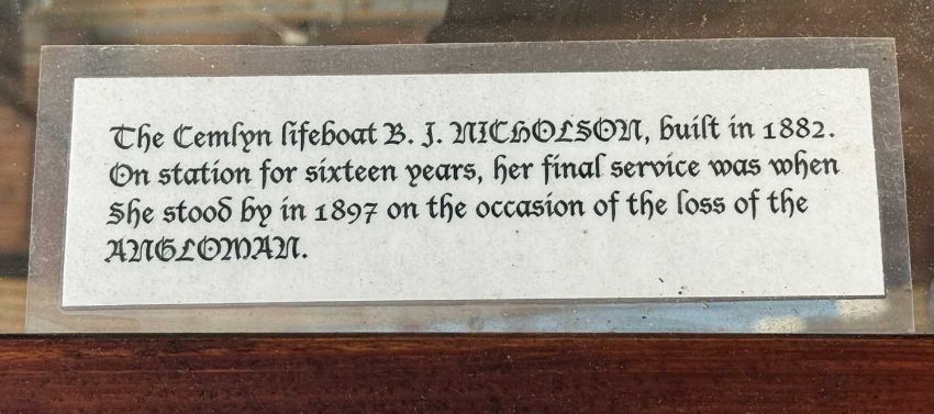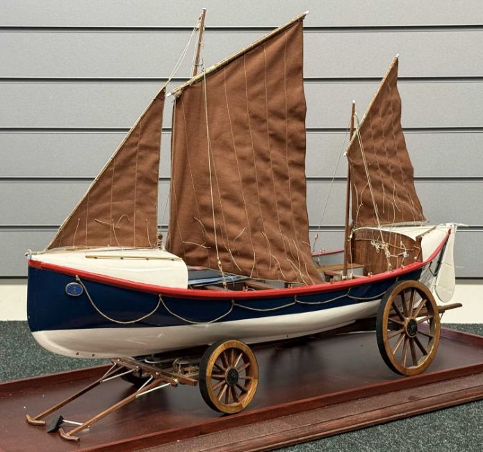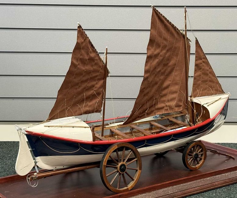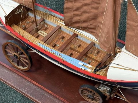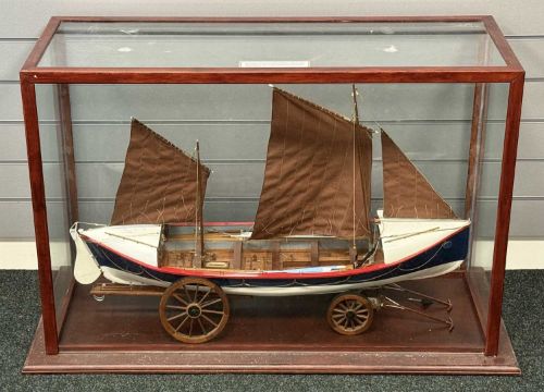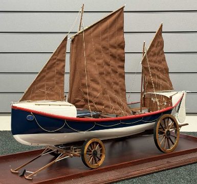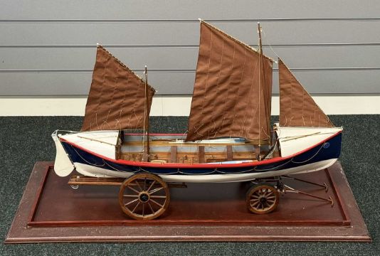 SCRATCH BUILT PAINTED WOODEN SCALE MODEL OF CEMLYN BAY LIFEBOAT B.J. NICHOLSON (built in 1882), on launching trolley and in glazed display case, 57 (h) x 104 (w) x 44cms (d)Provenance: private collection