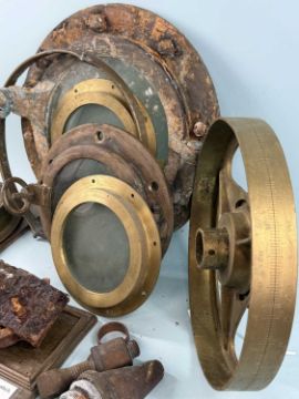 SHIPWRECK FINDS, including steam pressure gauge, recovered at Coal Rock, possibly from the Edith Owen, lost in 1879; compass base from The British Viscount, torpedoed north-west of The Skerries in 1918; pulley block salvaged from a fishing boat at Porth Wen; porthole with glass window and retaining clasp, etc.Provenance: private collection