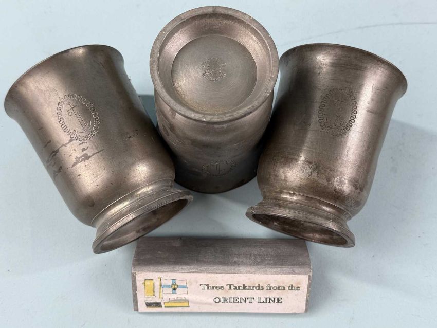 SHIPPING LINE MEMORABILIA / SOUVENIRS, four butterfly wing dishes, Queen Elizabeth, SS Orcades, RMS Aurania, SS Mont Clare; powder compact, SS Pyrrhus; cigarette lighter, RMS Edinburgh Castle; three-handled cup, RMS Orsova; desk calendar, RMS Laconia; Pacific Steam Navigation Company powder compact; three Orient Line tankards; Elder Dempster cigarette box; SS Carthage cigarette lighter; two spoons, Union Castle LineProvenance: private collection