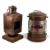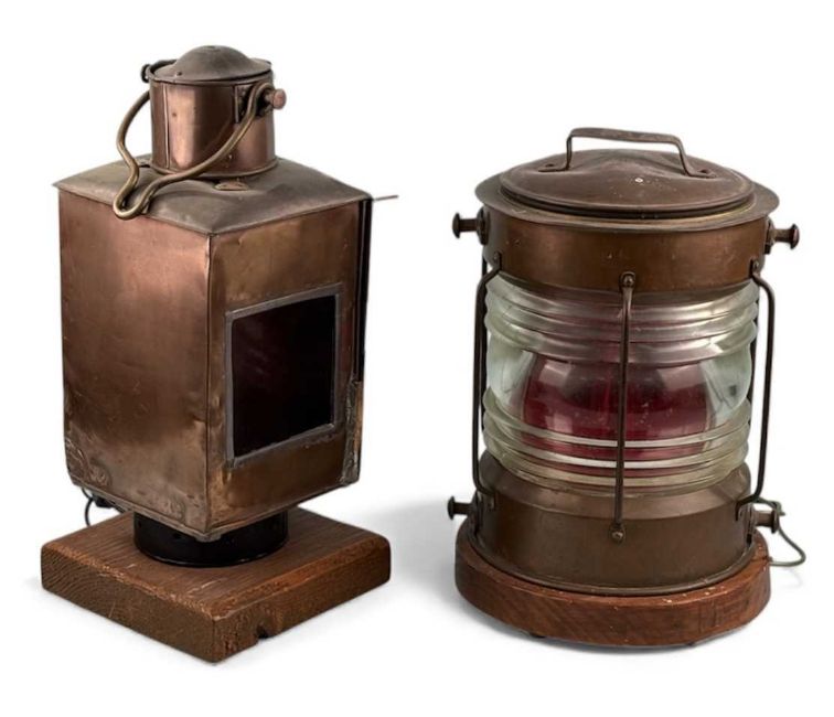 TWO COPPER PORT LAMPS, square on stained wooden base, 50cms (h); and circular on stained wooden base, 40cms (h)Provenance: private collection