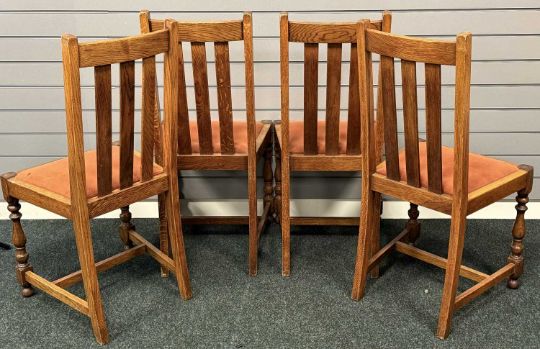 SIX DINING CHAIRS, four oak slat back with upholstered seats, and two modern light wood hoop and spindle backed examplesProvenance: private collection Cheshire