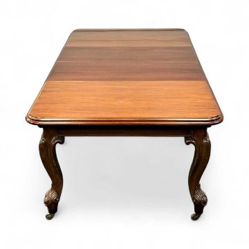 VICTORIAN MAHOGANY EXTENDING DINING TABLE, rectangular top with rounded corners and moulded rim, carved cabriole supports terminating on castors, with two leaves, 77 (h) x 234 (l) x 123cms (w) (extended)Provenance: private collection Cheshire
