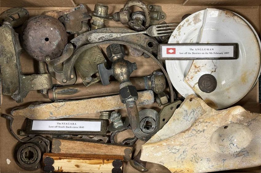 ASSORTMENT OF WRECK SALVAGE ITEMS, including items from the Abbotsford (Wylfa Head, 1875), the Earl of Chatham (Carmel Head, 1885), Angloman (Skerries, 1897)Provenance: private collection