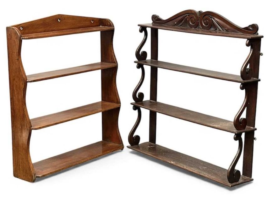 TWO NARROW WALL HANGING WOODEN SHELVING RACKS, 92 (h) x 92 (w) x 19cms (d) the largest (2) Provenance: private collection Cheshire