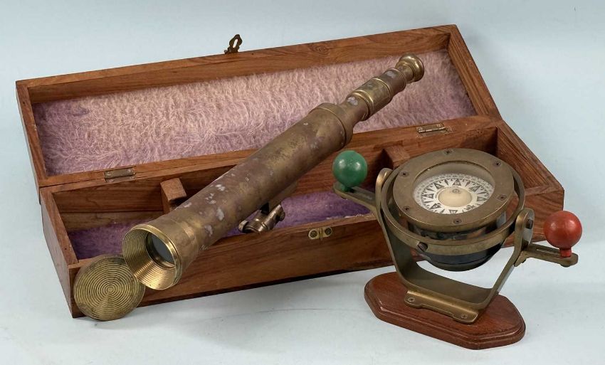 REPRODUCTION BRASS CASED TELESCOPE, 44cms (h), and a brass cased nautical compass on gimble stand with wooden base, 13cms (h) (2)Provenance: private collection