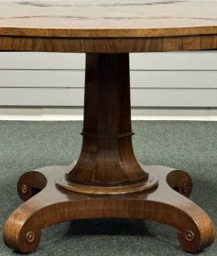 GOOD QUALITY LATE REGENCY CURL MAHOGANY & POLLARD OAK PEDESTAL BREAKFAST TABLE, finely figured top tilting over an octagonal column and quatraform base with concealed castors, 73 (h) x 137cms (d)Provenance: private collection Cheshire