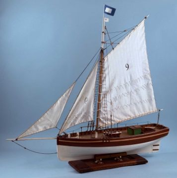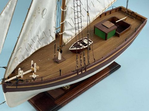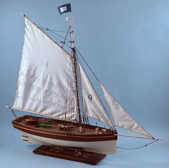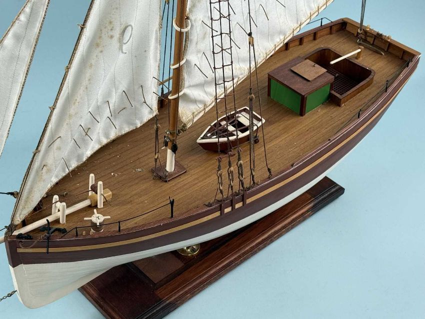 SCRATCH BUILT WOODEN SCALE MODEL SAILING BOAT, fully rigged, brown and cream hull, on stand, 84 (h) x 86 (l) x 21cms (w)Provenance: private collection