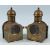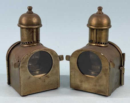 TWO EVER READY MAHOGANY & BRASS CASED BULLSEYE PORTABLE ELECTRIC LAMPS, early 1900, 18cms (h); and pair of small brass oil lamps, 16cms (h)Provenance: private collection