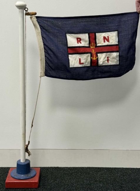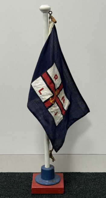 RNLI CLOTH FLAG, 46 x 28cms, hung on a painted wooden pole with circular cast-iron stand, 81cms (h) overallProvenance: private collection