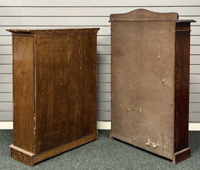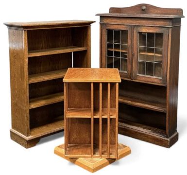 20TH CENTURY FURNITURE ASSORTMENT, to include oak open bookcase, 109 (h) x 79 (w) x 32cms (d); leaded glass twin-door bookcase, 127 (h) x 78 (w) x 22cms (d); and a revolving bookcase, 70 (h) x 47 (w) x 47cms (d) (3)Provenance: private collection Cheshire
