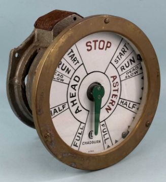 CHADBURN'S EARLY 20TH CENTURY SHIP'S TELEGRAPH, in brass and grey painted metal housing, white dial with lettering in black, 'Stop' and 'Astern' in red, 28cms (diam.)Provenance: private collection