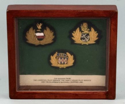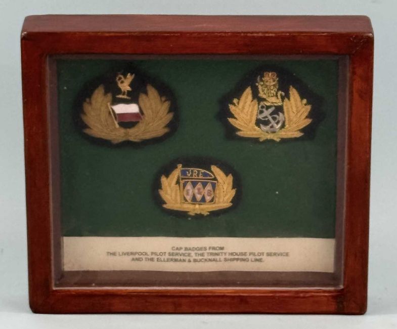 PICTURES & COLLECTABLES OF MARITIME INTEREST, comprising a paper tribute to The Lusitania, torpedoed in 1915; poster for the saloon steamer Rhos Colwyn; set of Ogden's cigarette cards, 'Flags and Funnels of Leading Steamship Lines'; bill of sale dated 16th March 1860 for four shares in the S.S. Liverpool, lost off Point Lynas in 1863; and three cap badges from the Liverpool pilot service, the Trinity House pilot service, and the Ellerman & Bucknall shipping lineProvenance: private collectionComments: all framed and glazed