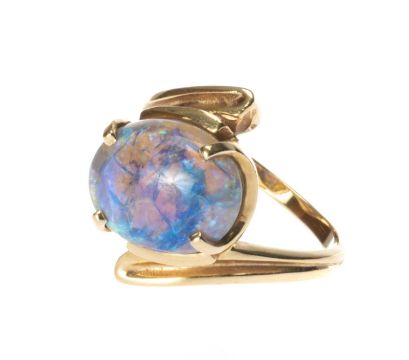 14CT GOLD OPAL RING, opal approx. 12 x 10mms, in a cross-over setting, ring size L, 5.1gProvenance: private collection ChesterComments: surface of stone cracked, internal natural fissures apparent, yellow gold setting good