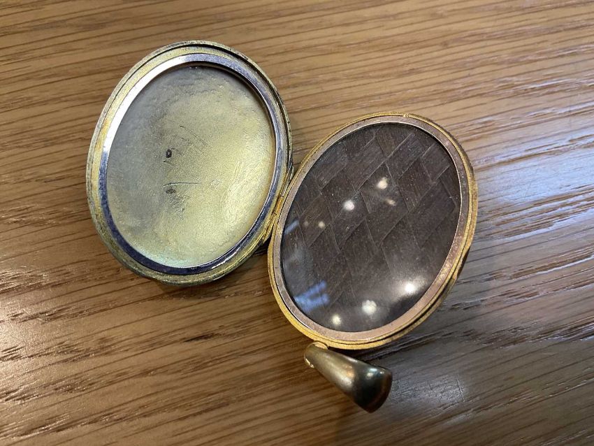 VICTORIAN YELLOW METAL SEED PEARL & ENAMELLED OVAL PICTURE LOCKET, c. 1890, opening to a woven hair insert, 38 x 30mms, gross weight 16.9g; together with a Victorian gold-plated and agate seal fob, initialled 'W.D.', 34mms (2)Provenance: private collection Flintshire