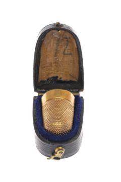 VICTORIAN YELLOW METAL THIMBLE, base engraved 'E. Dunn 1899', 2.5cms (h), weight approx. 5.8g, in case, with autograph note 'Dear Mother, I am sending you this little gift, which represents my first earning...from your affectionate daughter Dorothy'Provenance: private collection CardiffComments: slightly bent all over