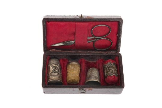 LATE GEORGIAN SEWING COMPANION, comprising filigree thimble container, base engraved with initial, beeswax thread lubricator, cylindrical pin cushion, steel scissors, and later associated thimble, in red Morocco leather case (hinge torn)Provenance: private collection Cardiff