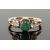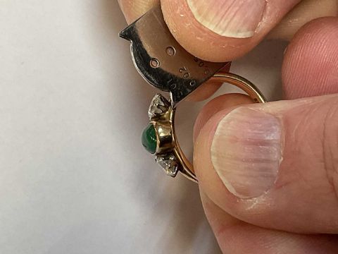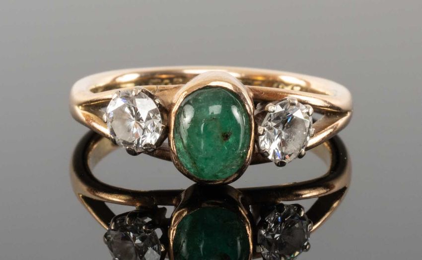 CABOCHON EMERALD & DIAMOND THREE-STONE RING, emerald approx. 6 x 5mms, in a collet mount flanked by two brilliant-cut diamonds, each approx. 0.25cts, in a 9ct gold split-shank ring, size P, 3.1gProvenance: private collection FlintshireComments: repair to shank at base of one diamond setting - see image