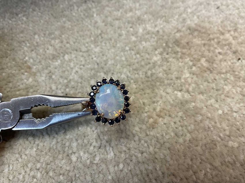 14CT GOLD OPAL & SAPPHIRE CLUSTER RING, opal approx. 12 x 10mms, ring size Q, 5.3gProvenance: private collection FlintshireComments: good condition, extremely light surface scratches, some minor variation in sapphire colour