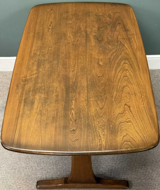 ERCOL DINING SUITE in medium-finish, comprising dresser, 169 (h) x 147 (w) x 51cms (d); dining table, 73 (h) x 153 (w) x 85cms (d); and two swan and spindle back carver chairs, 100 (h) x 68 (w) x 44cms (d)Provenance: private collection Conwy
