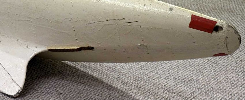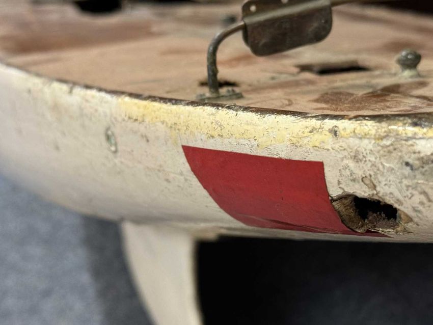 LARGE TIMBER MODEL SCRATCH-BUILT SAILBOAT HULL, titled 'Mystery', 38 (h) x 181 (w) x 38cms (d)Provenance: private collection Conwy