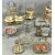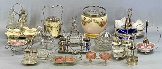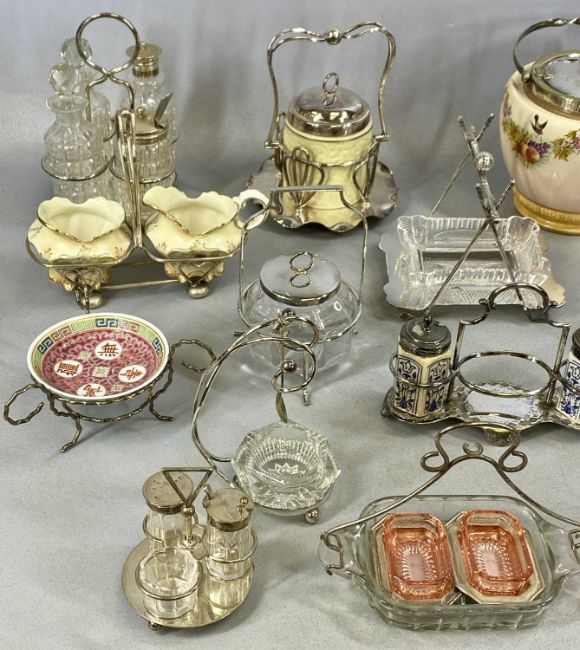 VARIOUS PLATED CRUET STANDS, having glass and ceramic fittings, including salts, condiments, sugar and cream bowls, together with a cream glazed biscuit barrel with EPNS mountsProvenance: private collection Gwynedd