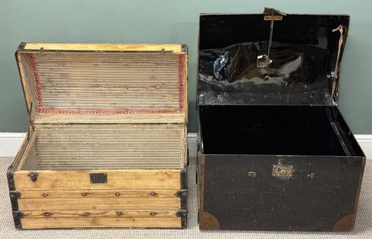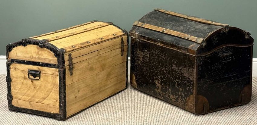 TWO VINTAGE DOME-TOP TRUNKS, black metal with wooden banding, 59 (h) x 77 (w) x 53cms (d); and a stripped timber with metal banding and handles, 51 (h) x 85 (w) x 46cms (d)Provenance: private collection Conwy