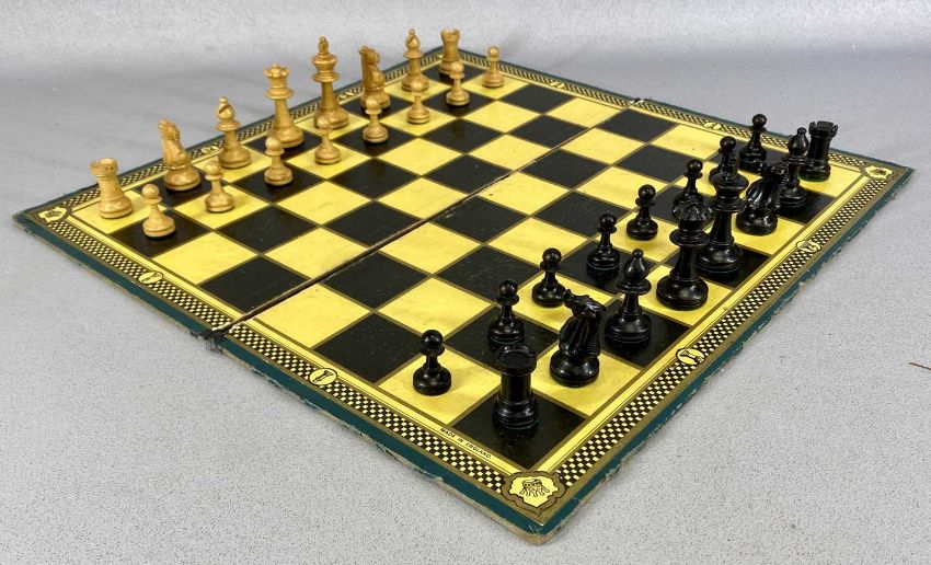 BOXED STAUNTON STYLE BOXWOOD WEIGHTED CHESS SET, together with boxwood draughts set, tin of dominoes, and two boardsProvenance: private collection Denbighshire