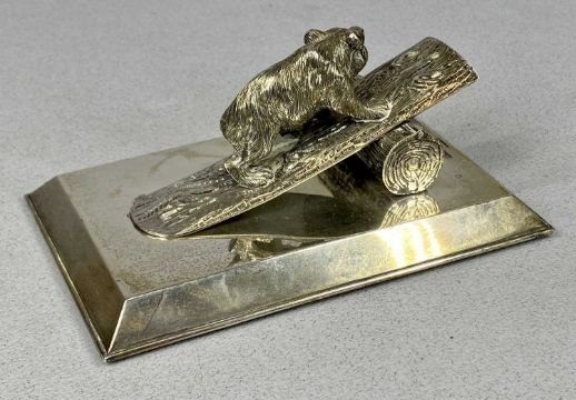 FINE QUALITY GEORGE V NOVELTY PAPERWEIGHT / MONEY CLIP, featuring a well modelled cast silver bear standing on a log, on rectangular loaded base, Mappin & Webb, London 1910, 6 (h) x 14 (w) x 9cms (d)Provenance: private collection Gwynedd