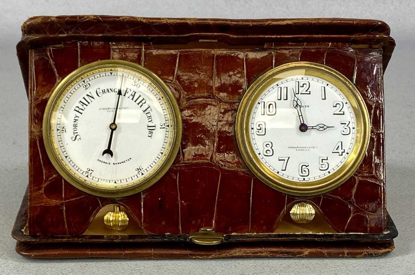 JOHN POUND & CO., LONDON TRAVELLING CLOCK & ANEROID BAROMETER, contained in brown crocodile skin case, 1920s, 18 x 11cms closedProvenance: private collection Denbighshire