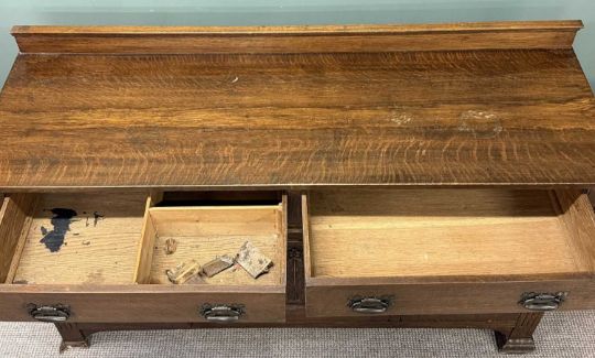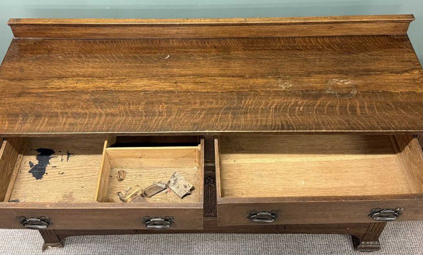 ART NOUVEAU OAK SIDEBOARD, with rail back, two long drawers over three cupboard doors, 102 (h) x 168 (w) x 54cms (d)Provenance: deceased estate Conwy